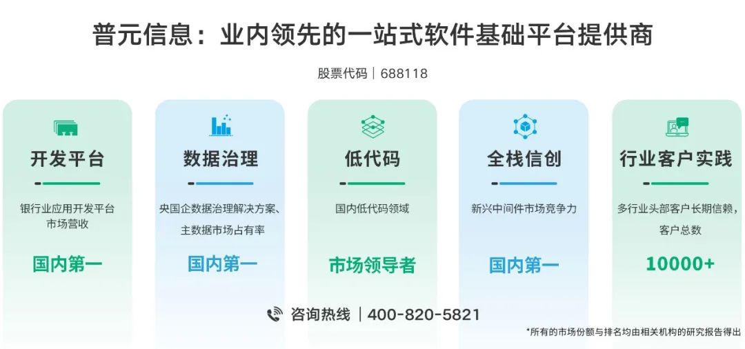 中国企业数字化联盟《央国企数据治理市场发展白皮书(2023)》显示,普元在央国企数据治理和主数据市场占有率第一。IDC《中国银行业IT解决方案市场份额,2023:考验定力时》报告显示,普元应用开发平台市场排名第一。计世资讯《2022-2023年中国中间件市场发展研究报告》显示,普元在新兴中间件领域处于领导者地位,产品技术能力、市场及战略能力均位列第一。普元股票代码688118,咨询热线400 820 5821。