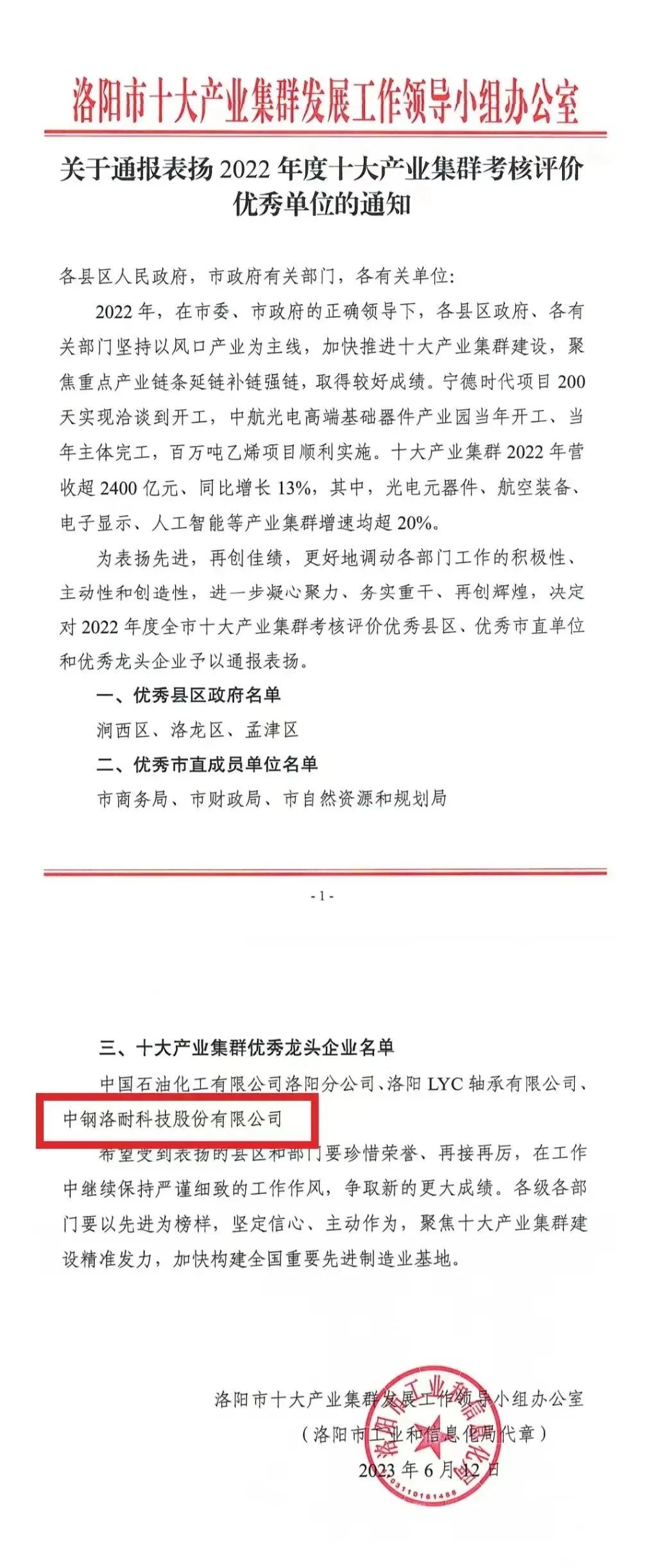 6月12日,洛阳市十大产业集群发展工作领导小组办公室发布《关于通报表扬2022年度十大产业集群考核评价优秀单位的通知》,中钢洛耐科技股份有限公司荣登“十大产业集群优秀龙头企业”名单。