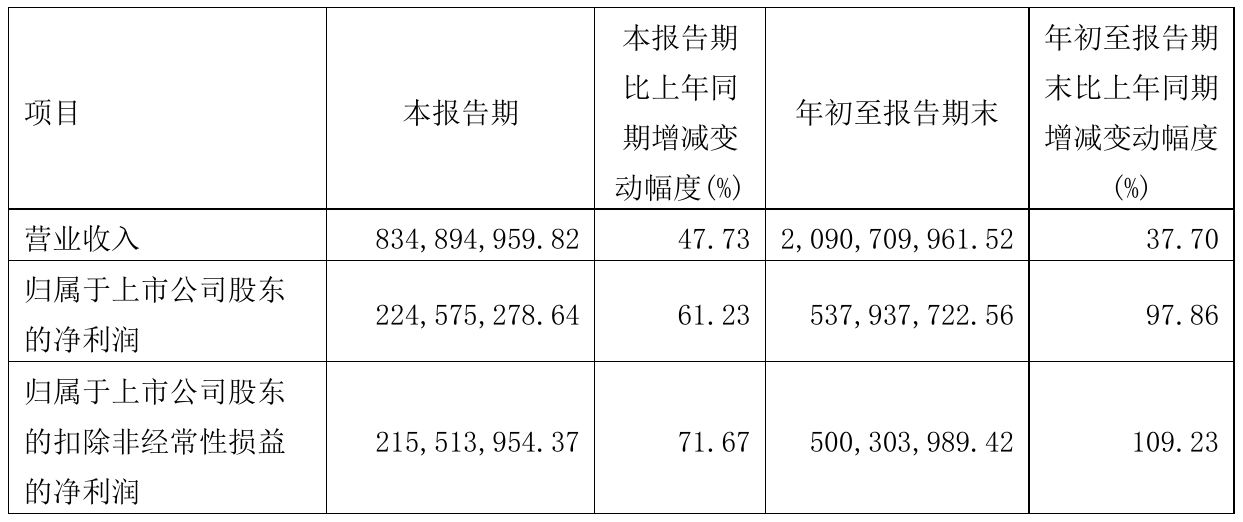 10月21日,西部超导(688122)近日发布2021年前三季度报告,报告期内营业收入2,090,709,961.52元,同比增加37.70%;净利537,937,722.56元,同比净利增加97.86%。