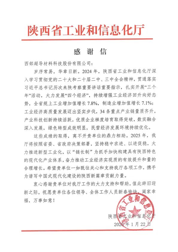 2025年1月22日,西部超导公司收到了来自陕西省工信厅的一封感谢信,信中对公司在稳增长、产业链引领等方面做出的突出贡献给予了高度赞扬。