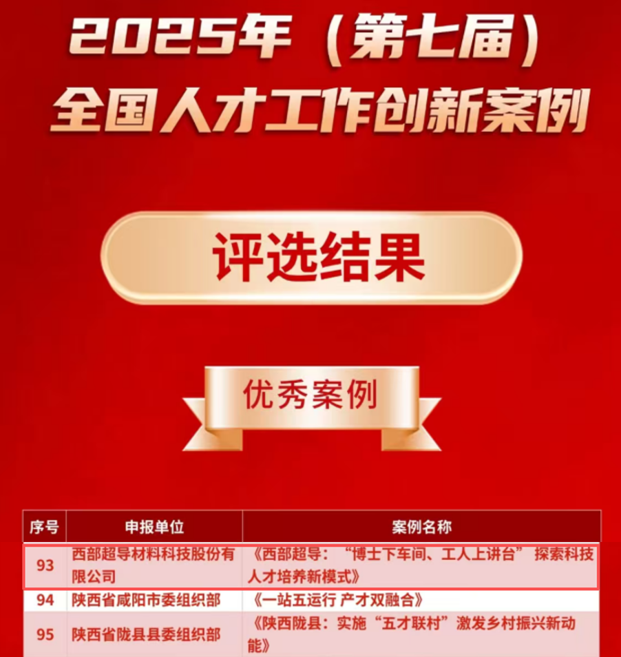 近日,中国人才杂志社主办的“2025年(第七届)全国人才工作创新案例征集评选活动”结果揭晓,共评出最佳案例50 篇、优秀案例 100 篇。西部超导公司的《西部超导:“博士下车间、工人上讲台”探索科技人才培养新模式》,凭借创新理念与实践成效,成功获评“优秀案例”。