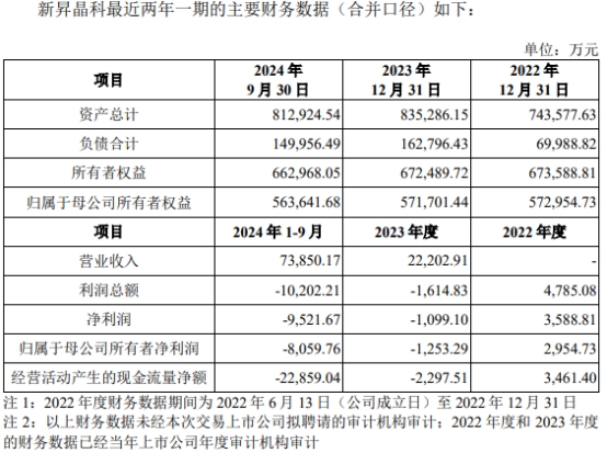 2022年度、2023年度、2024年1-9月,新昇晶科营业收入分别为0元、22,202.91万元、73,850.17万元,净利润分别为3,588.81万元、-1,099.10万元、-9,521.67万元,归属于母公司所有者净利润分别为2,954.73万元、-1,253.29万元、-8,059.76万元,经营活动产生的现金流量净额分别为3,461.40万元、-2,297.51万元、-22,859.04万元。