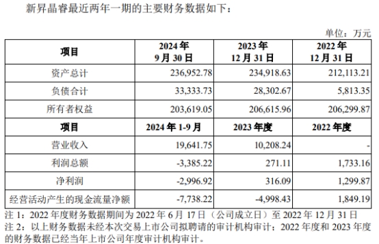 2022年度、2023年度、2024年1-9月,新昇晶睿营业收入分别为0元、10,208.24万元、19,641.75万元,净利润分别为1,299.87万元、316.09万元、-2,996.92万元,经营活动产生的现金流量净额分别为1,849.19万元、-4,998.43万元、-7,738.22万元。