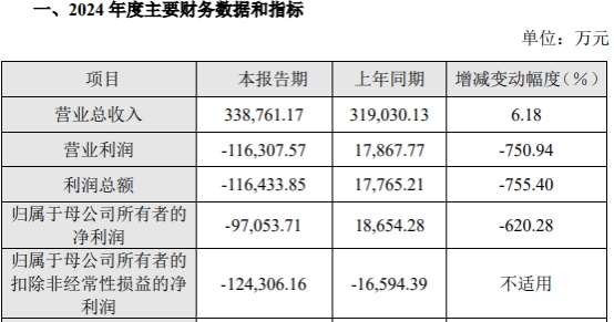 2024年,沪硅产业营业总收入为338,761.17万元,同比增长6.18%;归属于母公司所有者的净利润为-97,053.71万元,上年同期为18,654.28万元;归属于母公司所有者的扣除非经常性损益的净利润为-124,306.16万元,上年同期为-16,594.39万元。