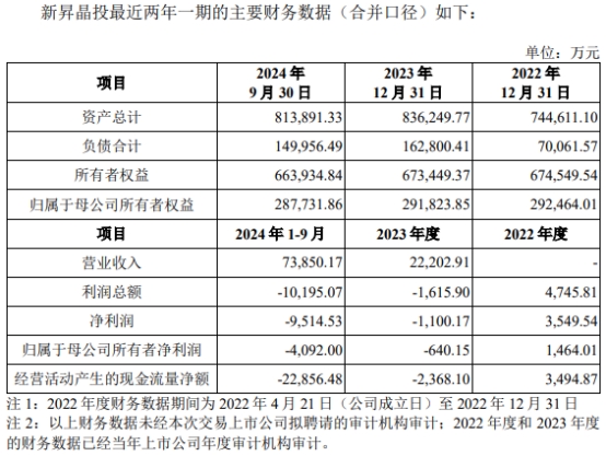 2022年度、2023年度、2024年1-9月,新昇晶投营业收入分别为0元、22,202.91万元、73,850.17万元,净利润分别为3,549.54万元、-1,100.17万元、-9,514.53万元,归属于母公司所有者净利润分别为1,464.01万元、-640.15万元、-4,092.00万元,经营活动产生的现金流量净额分别为3,494.87万元、-2,368.10万元、-22,856.48万元。