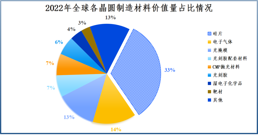 硅片是所有半导体材料中价值量最高的分支。参考2022年的统计数据,其价值量占比高达33%,远超光刻胶、光掩模等制造材料。