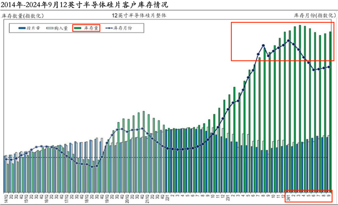 截至2024年9月,12英寸半导体硅片客户库存依旧处于高位,是2022年的两倍还多。