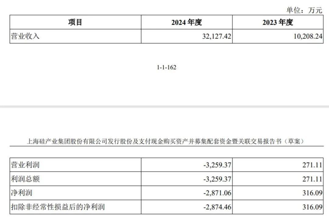 ②购买方上市公司沪硅产业是上海地区知名的半导体硅片加工企业,虽然公司在行业很知名,科创板上市之后最高市值超过了1900亿(现在还有560亿),但公司每年只有30亿元的收入,而净利润在最近几年从3亿元一直下滑,2024年直接由盈利变成亏损近10亿元。