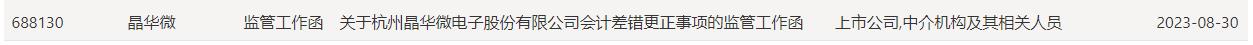 中国经济网北京8月31日讯上交所网站于8月30日公布对晶华微(688130.SH)的监管工作函,处理事由为关于杭州晶华微电子股份有限公司会计差错更正事项的监管工作函,涉及对象为上市公司、中介机构及其相关人员。