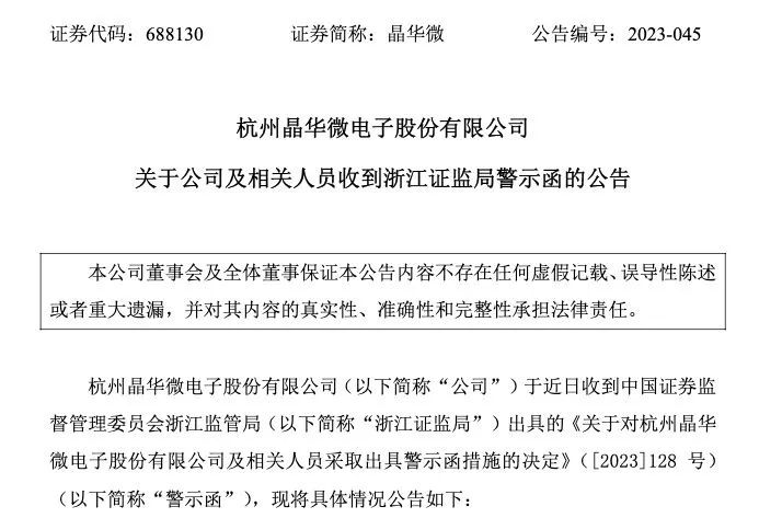 10月13日晚间,晶华微(688130.SH)发布公告称,因多项违规行为,公司及董事长吕汉泉、总经理罗伟绍、时任财务总监兼董秘周荣新等责任人被浙江证监局出具警示函。