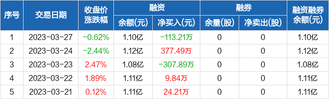 融资方面,当日融资买入664.95万元,融资偿还778.16万元,融资净偿还113.21万元。融券方面,融券卖出0股,融券偿还0股,融券余量0股,融券余额0元。融资融券余额合计1.1亿元。