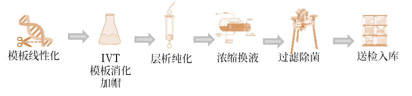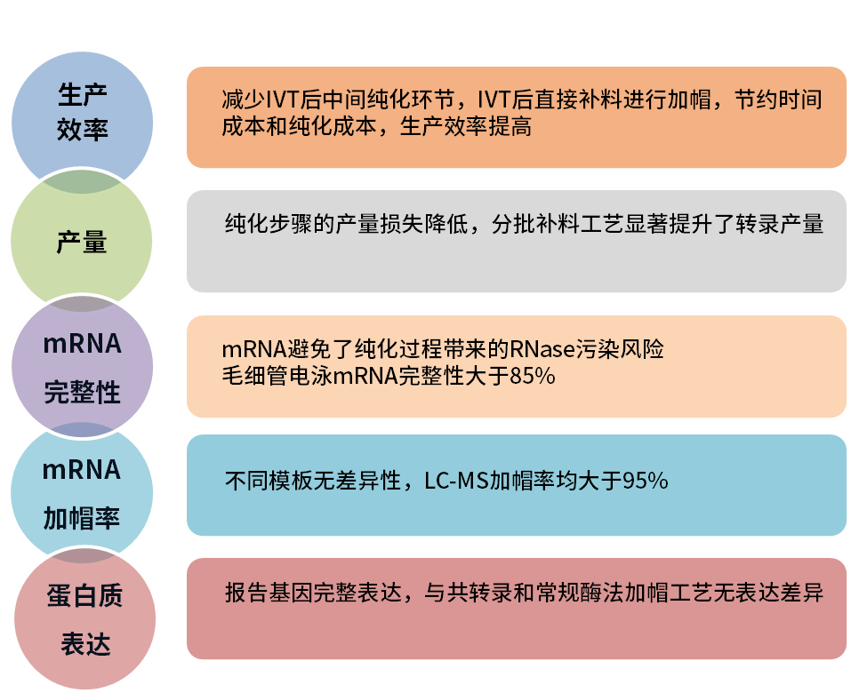“一管式”mRNA合成工艺涵盖了线性化模板制备——体外转录(In Vitro Transcription, IVT)——酶法加帽流程,整个过程省去了传统工艺中两步纯化步骤,大大提高的mRNA的生产效率。