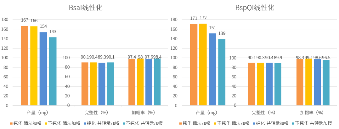 图例)分别使用BsaI和BspQI两种限制性内切酶进行酶切,对比酶切后纯化与不纯化工艺,在mRNA产量、完整性以及加帽率方面无明显差异。