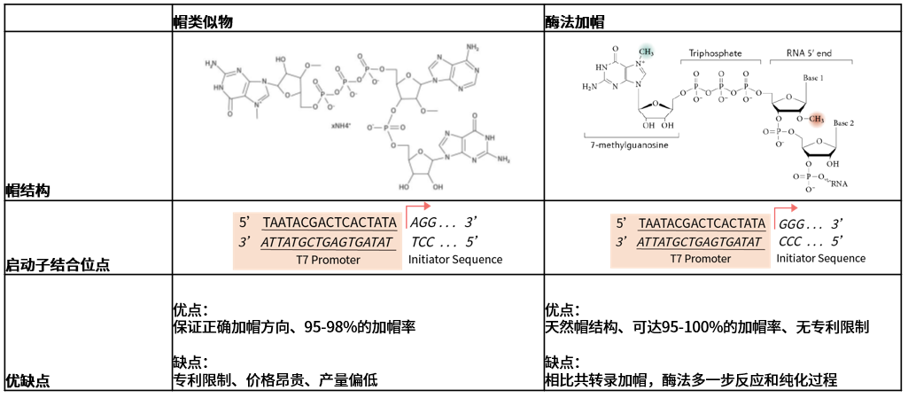 体外合成的RNA需要通过一定的合成过程完成5’端帽结构的添加,从而形成完整的mRNA结构。mRNA的完整性确保了蛋白质的准确翻译,5’-Cap帽结构修饰可以保护mRNA免受5''-外切酶活性降解、有效促进翻译的起始、降低免疫原性。常用的加帽工艺有两类,一类是在IVT结束后,通过牛痘病毒加帽酶和2’-O-甲基转移酶的共同作用,完成Cap1的修饰;一类是在IVT过程中,通过在体系内引入帽类似物,完成帽结构的修饰。两种方式在工艺、结果以及知识产权壁垒等方面各不相同。