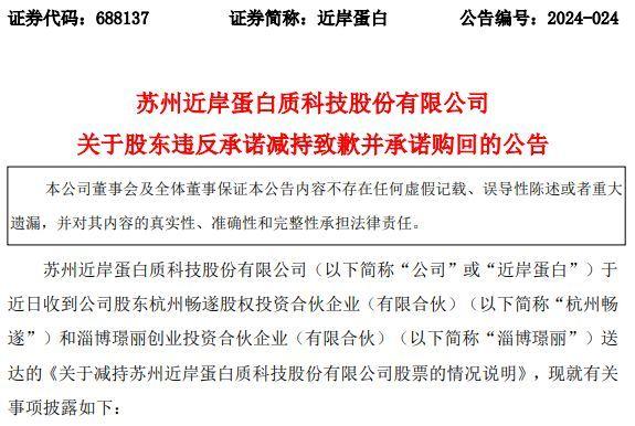 杭州畅遂和淄博璟丽承诺在规则允许的范围内,尽快购回违规减持近岸蛋白的股份,并承诺将购回股份产生的收益(如有)全部缴纳至近岸蛋白指定账户。