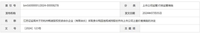 7月5日,江苏证监局关于对杭州畅遂股权投资合伙企业(有限合伙)、淄博璟丽创业投资合伙企业(有限合伙)采取责令购回违规减持股份并向上市公司上缴价差措施的决定。