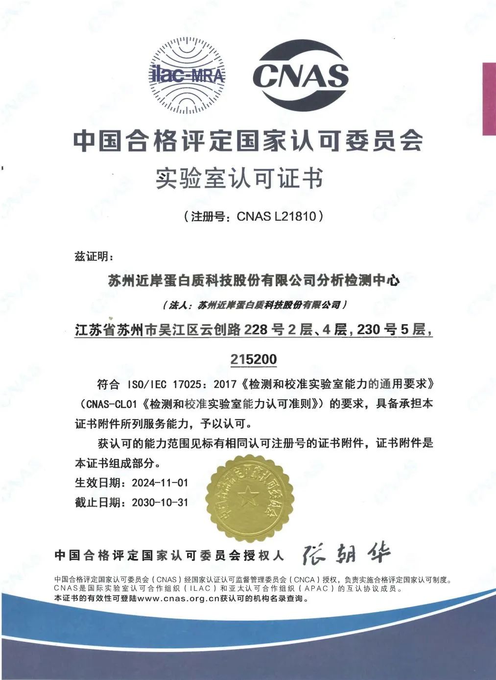 近日,苏州近岸蛋白质科技股份有限公司(以下简称“近岸蛋白”)分析检测中心经中国合格评定国家认可委员会(CNAS)批准(注册号:CNAS L21810),正式通过了mRNA加帽率、细胞表面蛋白表达、分子间亲和力、抗体亲和力、蛋白质含量、pH值检测6个检测方法的现场评审,并通过CNAS实验室认可。