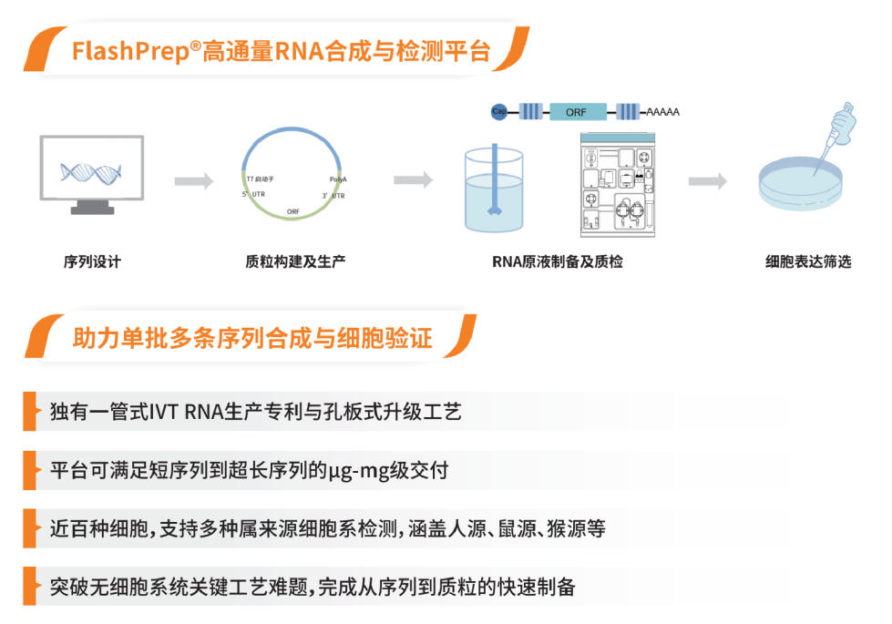 本次会议重点展示公司FlashPrep?平台,结合公司先进的RNA技术,该平台可以实现单批百条序列筛选,支持多种属来源细胞系表达检测,助力RNA研发提速。可提供序列设计、通量质粒制备、通量RNA制备、通量细胞表达筛选服务,专业团队全程评估,实现批量数据输出。