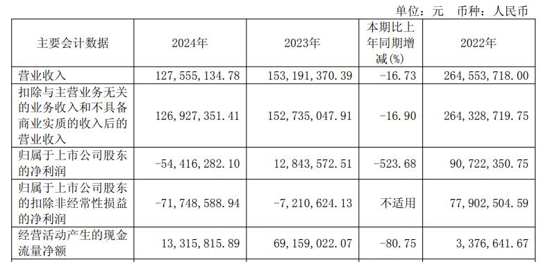 2024年,公司实现营业收入1.28亿元,同比下降16.73%;归属于上市公司股东的净利润为-5441.63万元,上年同期为1284.36万元;归属于上市公司股东的扣除非经常性损益的净利润为-7174.86万元,上年同期为-721.06万元;经营活动产生的现金流量净额为1331.58万元,同比下降80.75%