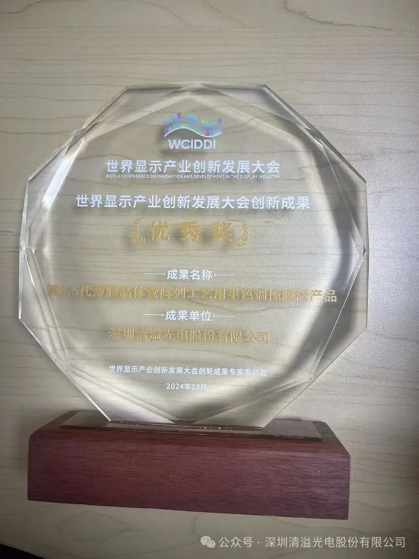 “清溢光电”)荣获世界显示产业创新发展大会“卓越表现企业”奖,产品“第8.5代薄膜晶体管陈列工艺用半色调掩膜版产品”荣获“创新成果优秀奖”。
