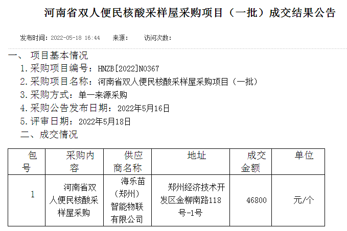 《河南省双人便民核酸采样屋采购项目(一批)成交结果公告》显示,核酸屋的供应商是海乐苗(郑州)智能物联有限公司,成交金额为46800元一个,采购方式是单一来源采购。采购人为河南省工业和信息化厅,采购代理机构为河南招标采购服务有限公司。