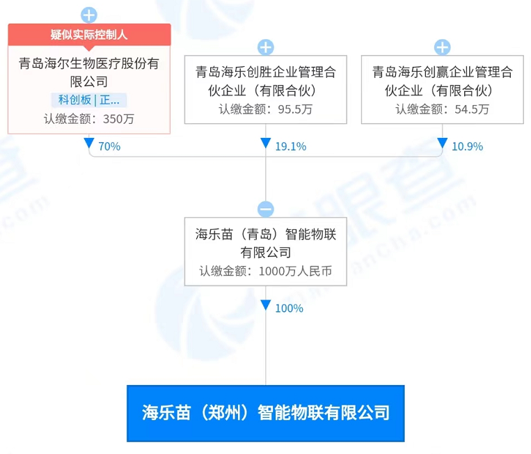 经过股权穿透发现,海乐苗(郑州)是海乐苗(青岛)的全资子公司,而后者成立于2021年1月,是上市公司海尔生物的控股子公司,持有其70%的股份。