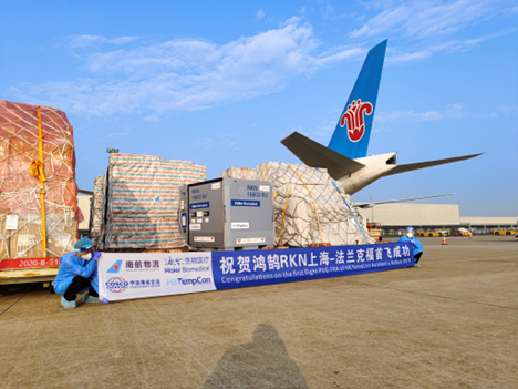 9月17日下午,海尔生物医疗主动式航空温控集装箱,搭乘南方航空物流有限公司(以下简称南航物流)CZ463货机航班,由中国上海浦东机场飞抵德国法兰克福机场。此次“中国上海-德国法兰克福”我国自主研发的主动式航空温控集装箱首条国际航空温控航线的开通,是由海尔生物医疗旗下专门负责航空温控业务的控股子公司——鸿鹄航空科技,联合青岛中远海运空运、南航物流共同完成。这也是继携手高宝国际货运圆满完成“上海-台北”首条地区航空温控航线飞行任务后,海尔生物医疗全球化航空温控产业的又一次突破,标志着“中国造”高端航空冷链物流装备正式登上国际竞争舞台,我国航空冷链物流产业正大跨步迈向专业化高速发展期。