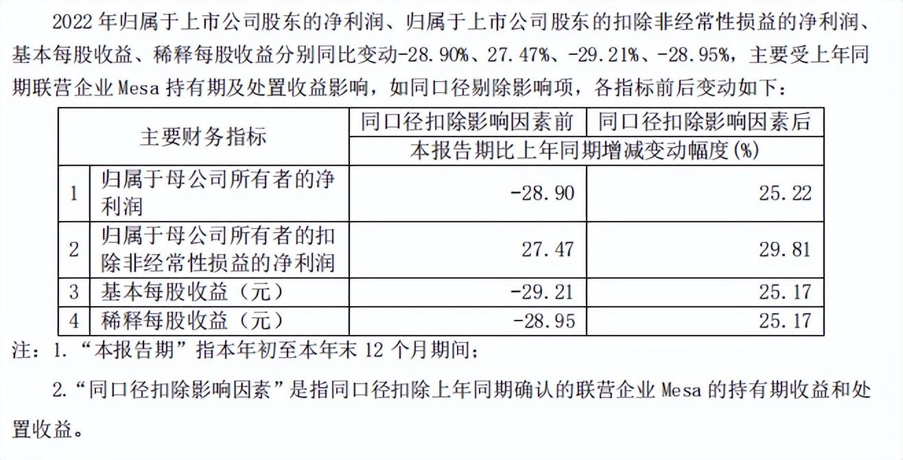 “2022年归母净利润、归属于上市公司股东的扣除非经常性损益的净利润、基本每股收益、稀释每股收益分别同比变动-28.90%、27.47%、-29.21%、-28.95%。”对此,海尔生物解释,“主要受上年同期联营企业Mesa持有期及处置收益影响。”
