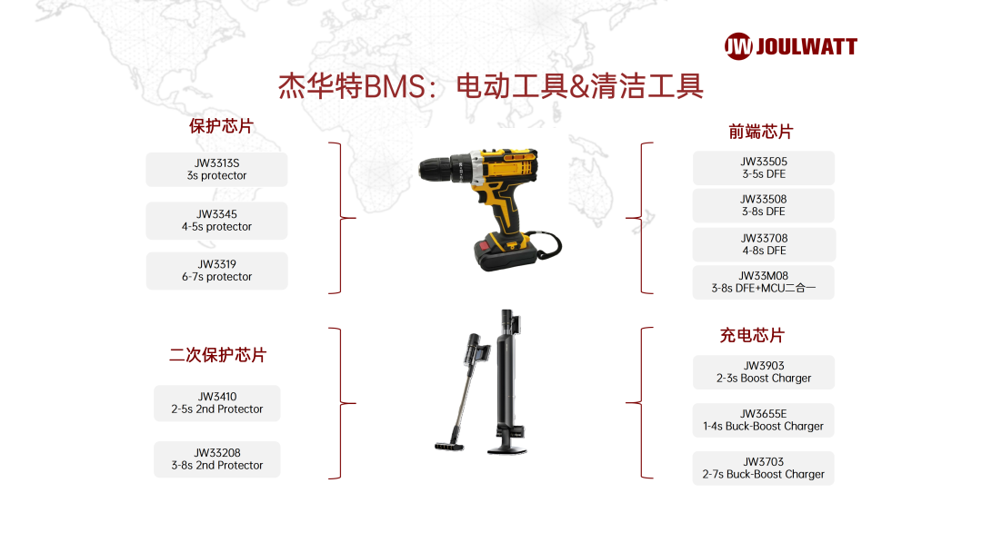 杰华特BMS产品覆盖3C产品、小动力电池、汽车电池和储能电池等多个应用领域,针对电动工具、清洁工具提供全序列3-8串锂电池BMS产品,为客户提供一站式锂电池BMS方案。其中包括:极简电池包设计用的硬件保护芯片、平台化电池包设计用前端芯片、高集成度电池包设计用前端/MCU二合一芯片、安规认证用二次保护芯片以及电池包内充电管理芯片。用“芯”赋能,驱动行业发展,满足客户的多样需求。