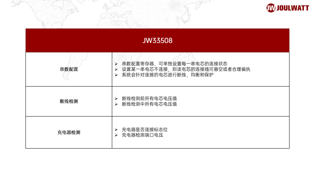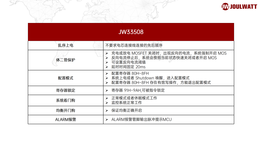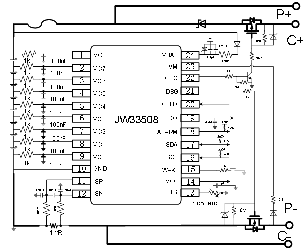 JW33508是专为3-8串锂电池组设计的数字前端芯片,特别适用于无线吸尘器或者洗地机的BMS设计。此外杰华特同步提供内置 MCU 的产品 JW33M08,适用于 3-8 串高集成度电池包。