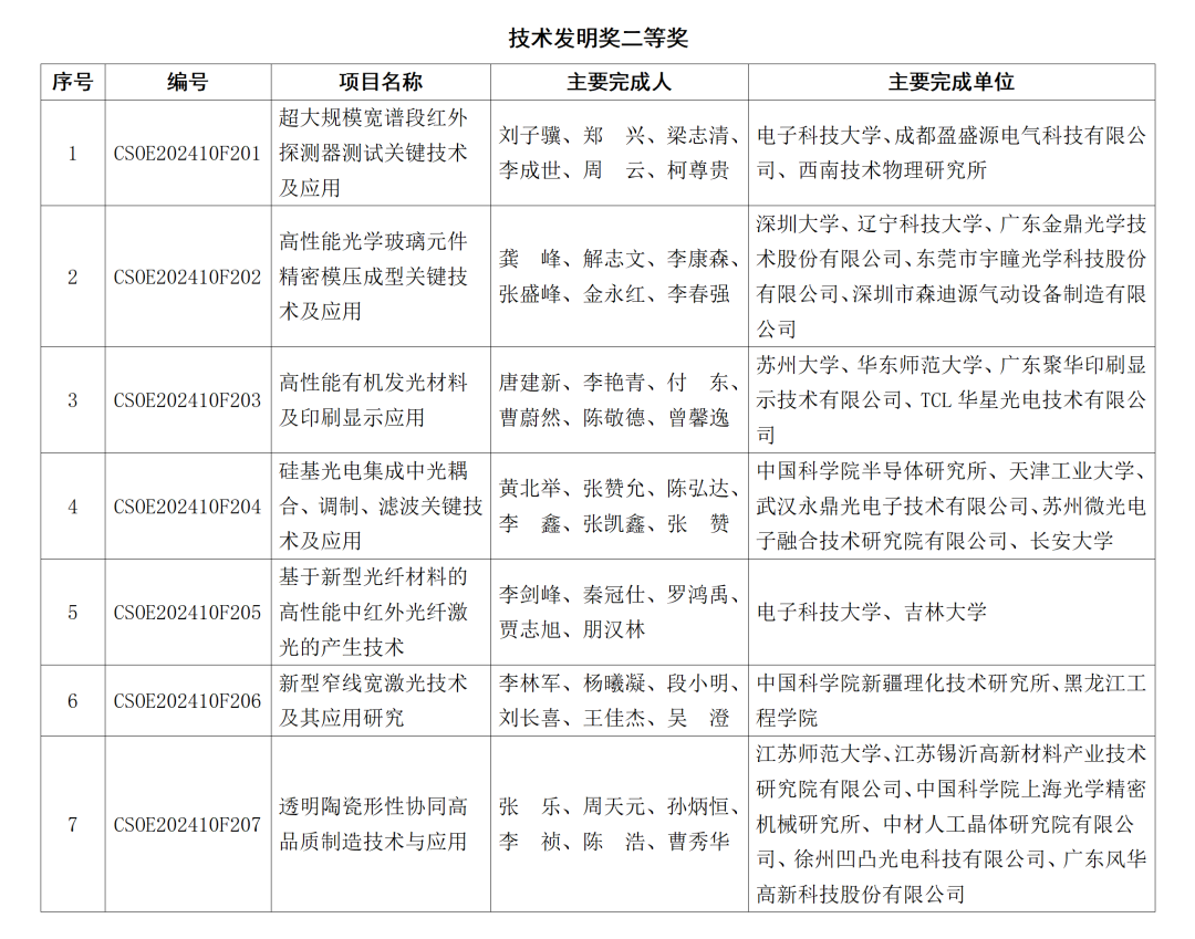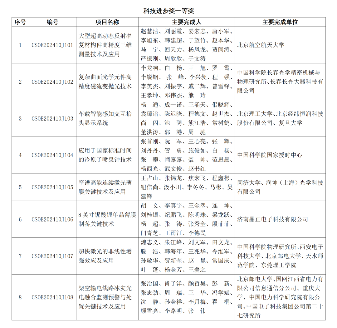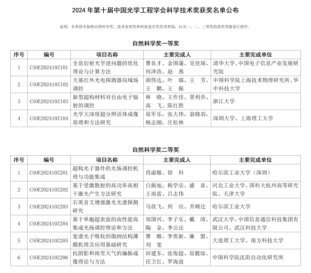 根据《中国光学工程学会科学技术奖管理办法》,第十届“中国光学工程学会科学技术奖”在广大会员和相关单位的积极参与下,所有申报项目经过形式审查、函评和现场答辩等环节,终评委员会本着质量第一,宁缺毋滥的原则,最终评选出“自然科学奖”10项、“技术发明奖”15项和“科技进步奖”21项。其中,“自然科学奖”一等奖4项、二等奖6项;“技术发明奖”一等奖8项、二等奖7项;“科技进步奖”一等奖8项、二等奖13项。经过为期5个工作日的公示,现将最终获奖名单公布如下: