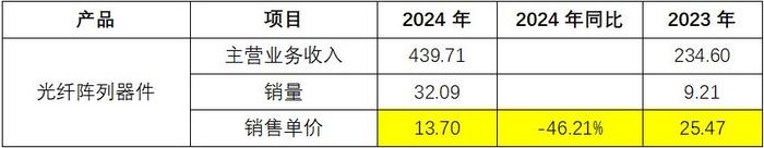 此外值得一提的是,标的公司光纤阵列器件产品毛利率维持稳定的合理性也高度存疑。2024年,标的公司光纤阵列器件产品的毛利率为32.83%,于公司各大产品中位列首位,并较2023年33.72%的毛利率水平基本保持稳定。但从毛利率动因分析来看,销售价格方面,通过重组报告书所披露该产品销量与对应营业收入进行测算,如下表所示,2024年标的公司光纤阵列器件产品的单位销售价格为13.70元/个,较2023年25.47元/个的销售单价同比出现断崖式下滑高达46.21%。