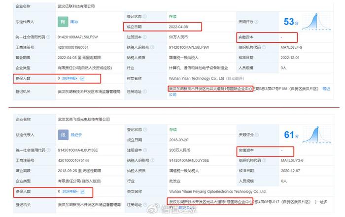 此外,标的公司报告期内的主要供应商也存在诸多异常情况。其中,武汉亿联科技有限公司于报告期内均为标的公司前五大供应商,标的公司向其采购原材料主要为毛细管,2024年的采购额达332.37万元,占原材料采购总额的比例为10.00%。而根据相关数据显示,亿联科技的实缴资本与参保人数目前均双双挂零;且其成立时间为2022年4月,此即意味着亿联科技于成立不久后的2023年便快速成为了标的公司的主要供应商。2023年,向标的公司提供光芯片的另一大供应商武汉艺栾飞扬光电科技有限公司,其目前同样实缴资本、参保人数均为0。同时值得特别注意的是,前述两大供应商不但与标的公司一样都位于武汉光谷,而且两家供应商的注册地址还极为接近,其均在光谷大道特1号国际企业中心。