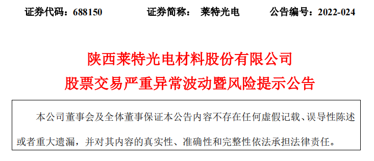6月7日晚间,近期遭热炒的科创板股票莱特光电(688150.SH)发布公告,公司股票交易连续10个交易日内(2022年5月24日至2022年6月7日)3次出现连续3个交易日内收盘价格涨幅偏离值累计达到30%,根据有关规定,属于股票交易严重异常波动。