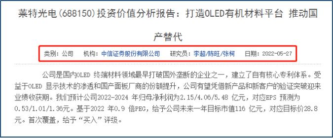 资料显示,最近两个多月,仅有中信证券一家发布了针对莱特光电的研报,而中信证券,也是莱特光电上市之时的保荐券商。