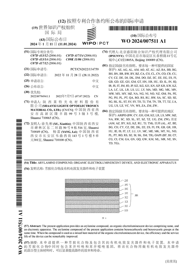 数据显示莱特光电(688150)公布了一项国际专利申请,专利名为“芳胺化合物及有机电致发光器件和电子装置”,专利申请号为PCT/CN2022/134759,国际公布日为2024年1月11日。