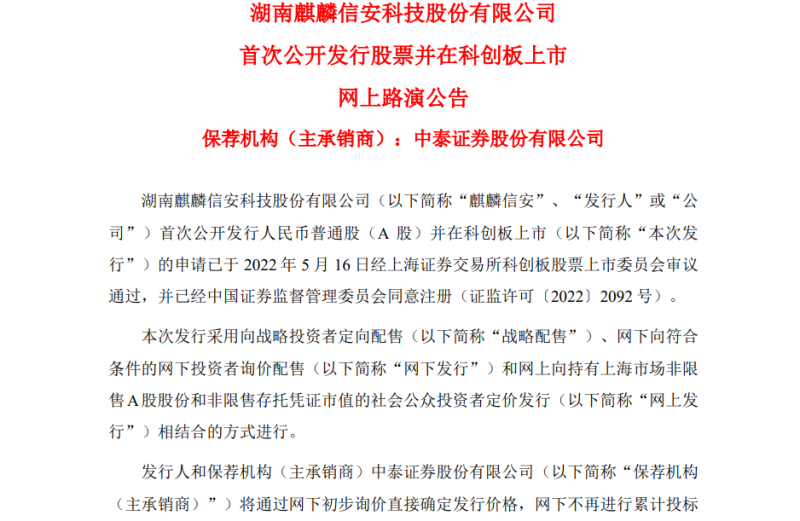 蓝鲸TMT频道10月12日讯,10月12日,麒麟信安公告显示,其首次公开发行股票并在科创板上市网上路演,路演时间为10月13日9:00-12:00。