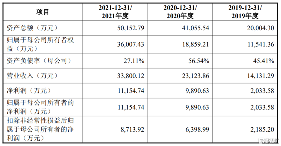 经营成果方面,公司的营业收入由2019年的1.41亿元增长至2021年的3.38亿元,归母净利润则由2033.58万元增至1.12亿元,三年累计分红超2000万元。