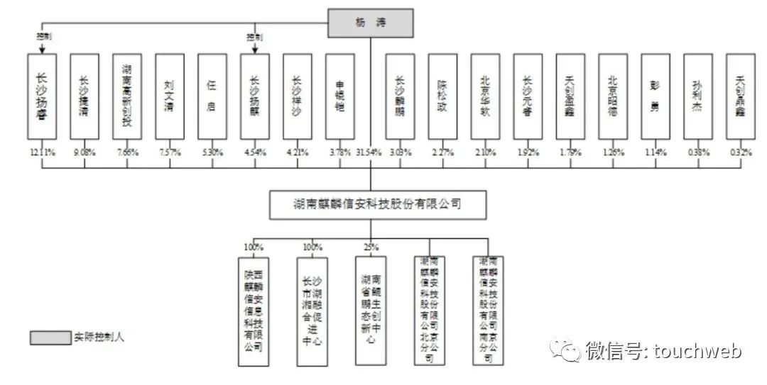 IPO前,杨涛直接持有31.54%股份,通过长沙扬睿间接控制12.11%股份,通过长沙扬麒间接控制4.54%股份,合计控制48.19%股份,为麒麟信安的控股股东及实际控制人。