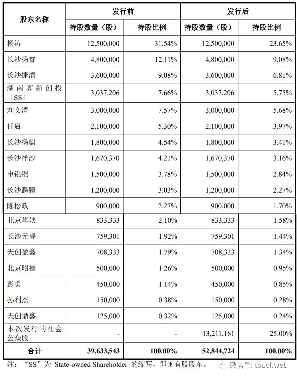 IPO后,杨涛持股23.65%,长沙扬睿持股9.08%,长沙捷清持股6.81%,湖南高新创投(SS)持股为5.75%,刘文清直接持股5.68%,任启持股为3.97%。