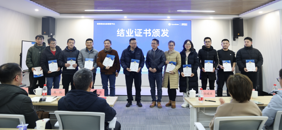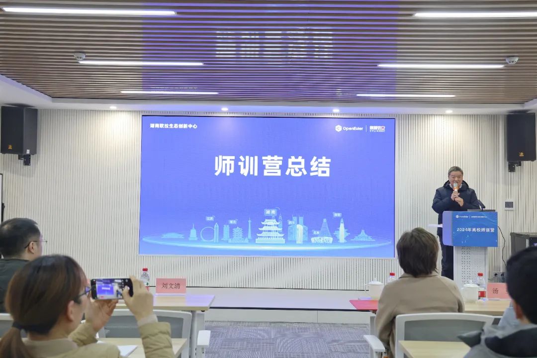 结营仪式上,湖南鲲鹏/昇腾生态创新中心COO 唐勇为学员代表授予结业证书。麒麟信安公司总裁、湖南欧拉生态创新中心执行董事刘文清作总结发言。