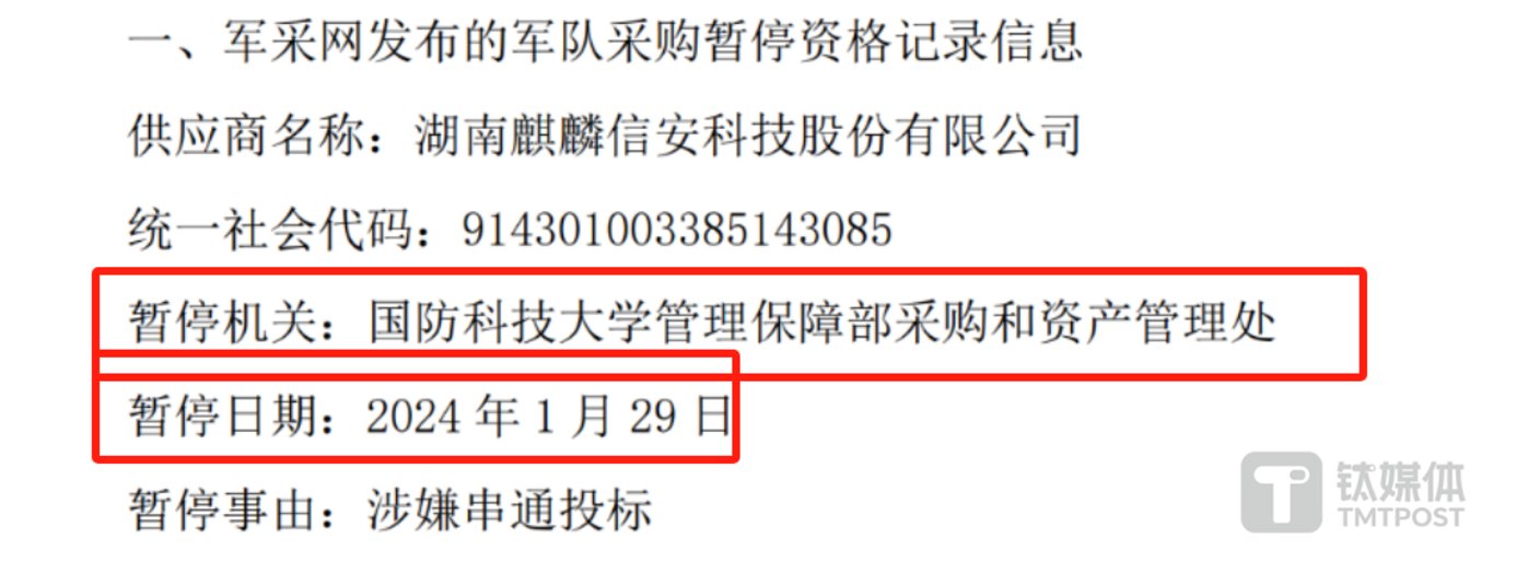 日前,麒麟信安(688152.SH)发布公告称,因涉嫌串通投标,公司自2024年1月29日起被列入军队采购网军队采购暂停名单。对此,公司表示,该事项正处于调查阶段,将立即组织人员自查并积极准备申诉。目前公司整体经营情况正常,在暂停日前已签订的相关合同仍可以正常执行。