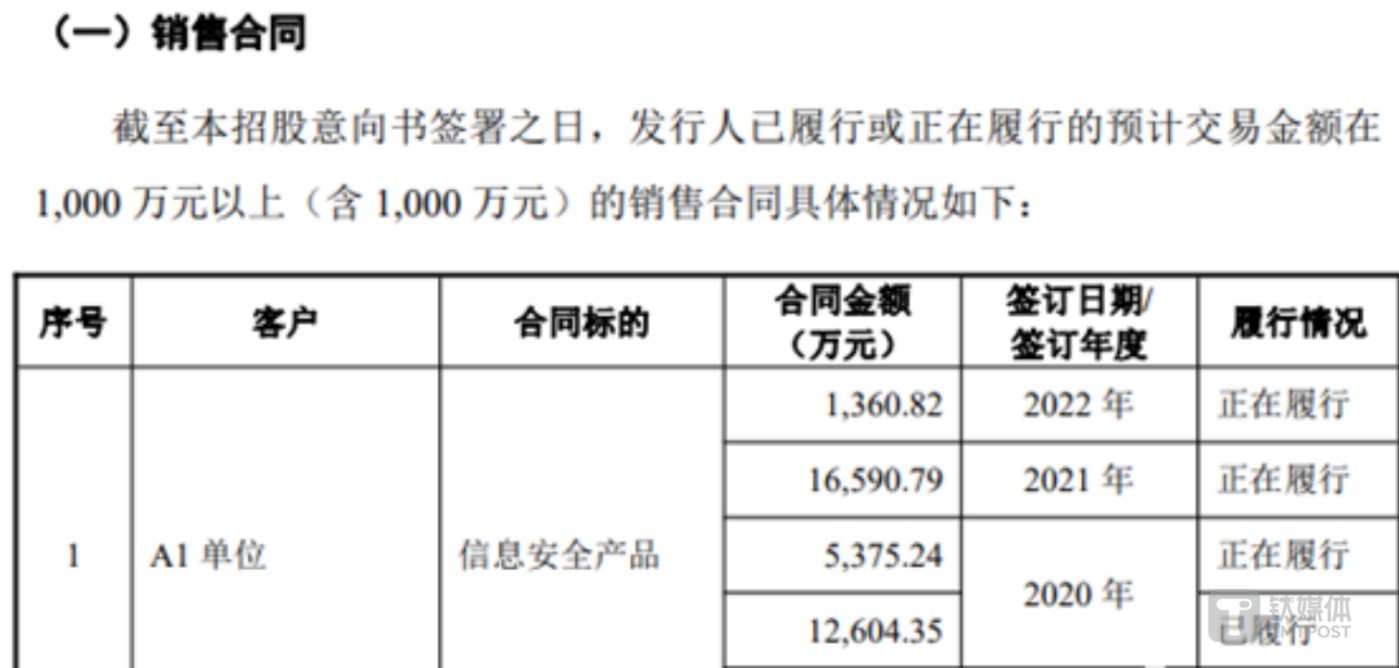 大客户依赖的核心风险,可能在于对大客户的销售无法持续,这恰恰充分暴露在公司的数据当中。根据招股书披露的重大客户信息,公司与A1单位签订的销售合同,在2022年大幅下滑,只有1300多万元,这与2020年和2021年每年1.7亿元左右的签约额相比差太多。