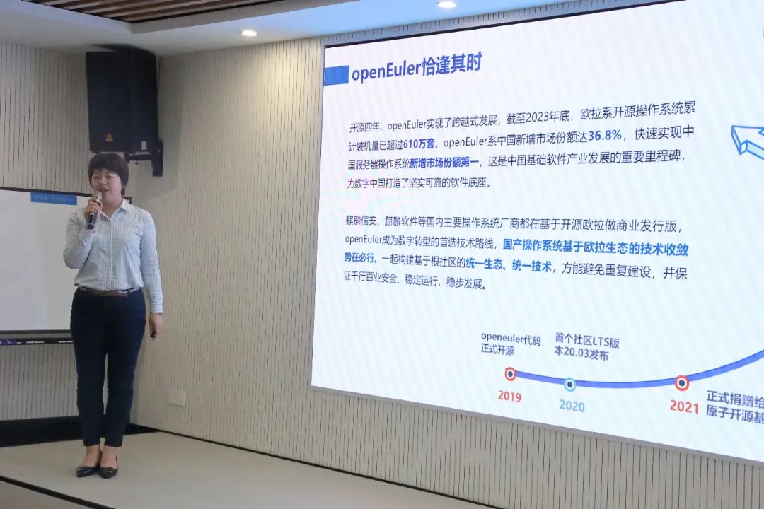 本次活动邀请三湘银行科技处总工胡丁分享《基于openEuler的行业应用实践》,依托麒麟信安提供的Convert2KylinSec可视化迁移工具,三湘银行将原有生产环境中部署的近千套RedHat操作系统平滑迁移为麒麟信安操作系统和openEuler操作系统,迁移过程简单易用、兼容性强、稳定可靠,业务无需重新部署。系统迁移夯实了三湘银行IT信息化系统安全底座,为金融行业自主创新推广提供了可借鉴的技术路线。截至2023年底,openEuler系开源操作系统累计装机量已超过610万套,openEuler操作系统中国新增市场份额达36.8%,快速实现中国服务器操作系统新增市场份额第一,成为推动千行百业转型升级、赋能数智未来的重要根基和支点。