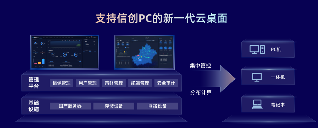 在技术趋势方面,随着云计算技术的持续成熟和完善,上云已成为党政领域及各行各业实现数字化转型的必然趋势。电子政务等一系列应用已全面铺开,各类业务系统经过整合,均已实现云化管理。通过引入新一代云桌面技术,对关键业务国产PC进行云化纳管,能实现云计算技术与传统PC技术的无缝对接与完美融合,从而补全了党政领域及各行业业务上云的最后一环,真正实现全面云化的目标。