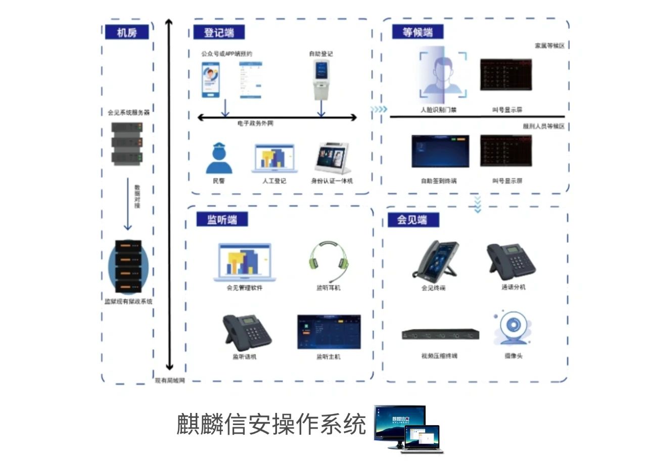 面对这一挑战,该监狱选择采用麒麟信安操作系统进行系统迁移改造。华亭科技亲情会见管理系统基于麒麟信安操作系统,将排队叫号、自助登记、会见预约、通道管控等环节有机整合,实现规范、可控的智能化会见管理。