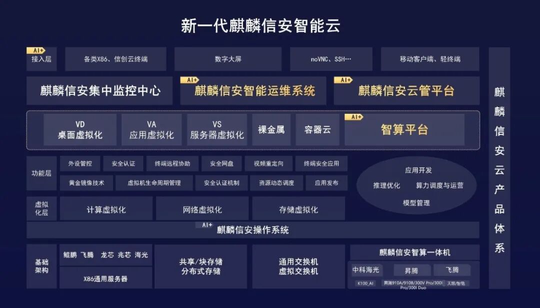 新一代智能云基于 麒麟信安 操作系统这一自主根技术底座,构建四大AI赋能产品矩阵,形成从基础设施到应用场景的完整闭环。