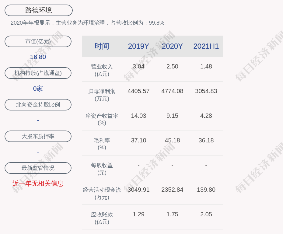 2020年年报显示,路德环境的主营业务为环境治理,占营收比例为:99.8%。