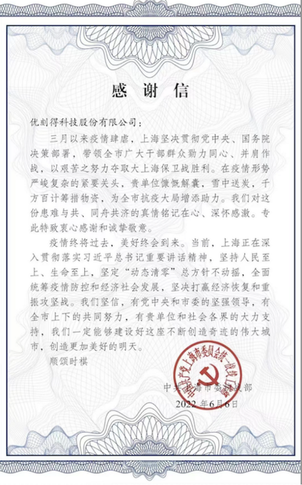 近日,UCloud优刻得收到来自上海市委统战部的感谢信,对UCloud优刻得在抗疫工作中做出的贡献,表示高度肯定和衷心感谢。