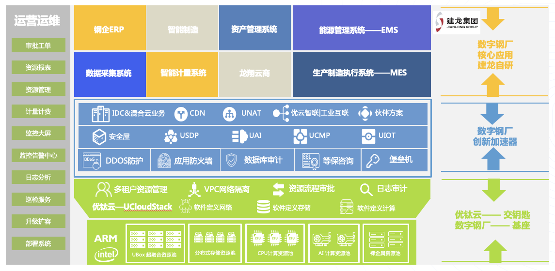 基于宁夏建龙良好的生产体验,建龙集团对建设全集团的数字化底座更有信心,开始着手进行全集团2级组织,1个总部+14家钢厂的整体性数字化转型工作。在本次建设中,UCloud优刻得将通过优钛私有云,构建集团总部的数字化底座;同时纳管二级分支机构的私有云平台,实现集团总部管理侧与钢厂生产侧分支云的全面双向数据流动与融合。